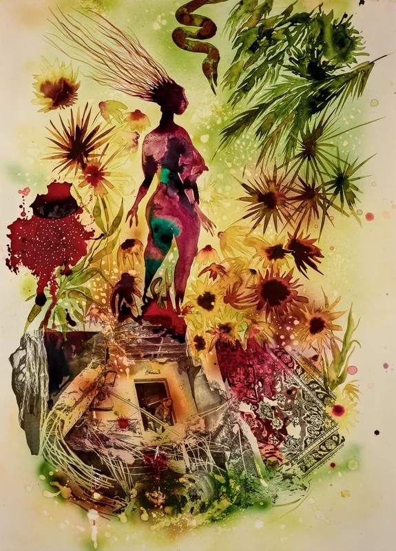 시바 아마디는 정치적, 종교적 권력을 비판하는 이미지로 페르시아의 미니어처 그림 전통을 업데이트합니다 . 주로 종이와 아쿠아 보드에 수채화 로 그림 을 그리며, 금색 잉크로 화려한 꽃무늬를 그린 아마디는 폭군 통치자가 통치하고 동물과 잡종 생물이 사는 환상적인 세계를 떠올립니다. 전쟁으로 인한 파괴와 혼돈에 대한 경험을 바탕으로(그녀는 이란-이라크 전쟁 당시 이란에서 살았습니다) 아마디는 폭탄과 수류탄을 휘두르는 얼굴 없는 인물과 피를 암시하는 적갈색 페인트 얼룩으로 그림을 채웁니다. 둘 다 작품의 장식적인 시각적 특성을 드러냅니다. 능숙한 붓놀림으로 전달되는 그녀의 인물은 종종 추상화로 변형되어 사회 질서의 얇은 표면 아래에 깔려 있는 혼란을 암시합니다. 아마디의 작품은 인도, 페르시아, 터키 회화의 영향을 보여주며, 현대 파키스탄 화가 샤지아 시칸더 의 미니어처와 비교되었습니다 .